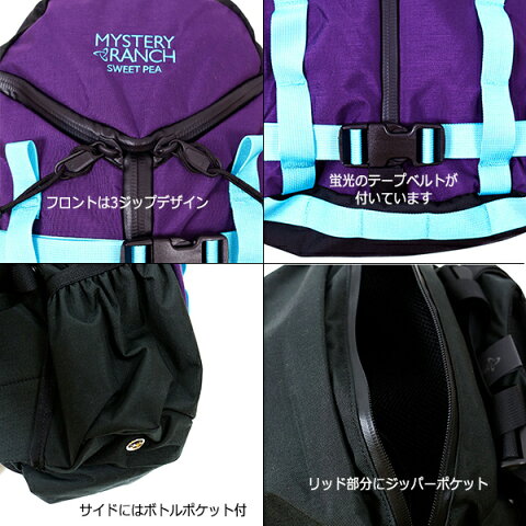 ITEM SPEC Brand MYSTERY RANCH(ミステリーランチ) Item Name SWEET PEA (スイートピー) Color THROWBACK Size サイズ計測方法は SIZE CHARTを ご確認ください W29cm/H46cm/D22cm 容量 33L 重量 1,660g Featured THROWBACKコレクション 3ジップデザインフューチュラヨークシステム 500デニールコーデュラナイロン使用 サイドポケット、リッドポケット 二重生地のボトム 収納可能なウエストベルト Notice ▼長時間濡れたままで重ねて置いたり、摩擦(特に湿った状態での摩擦)や、汗や雨などでぬれた時は他の衣料等に移染する場合がございますのでお気を付け下さいませ。